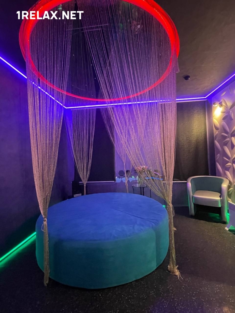 Пять комнат заведения оформлены в фиолетовой, синей и красной цветовой гамме. Неоновая подсветка придает своеобразный космический эффект, а аккуратно вписанные в дизайн восточные элементы погружают в атмосферу экзотики и роскоши. Пикантности добавляют огромные зеркала во всю высоту комнат.